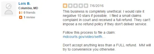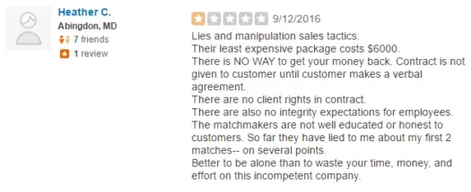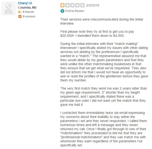 Maryland Matchmakers has a 1-star rating on Yelp. In fact, right now the 14 current recommended reviews and 11 not currently recommended ones are all 1 star.