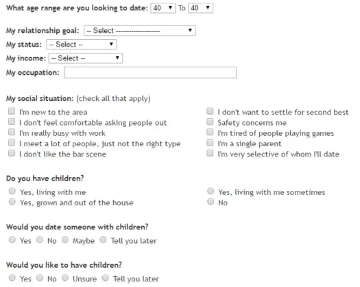 The online form includes basic background questions about yourself and what type of relationship you’re seeking: