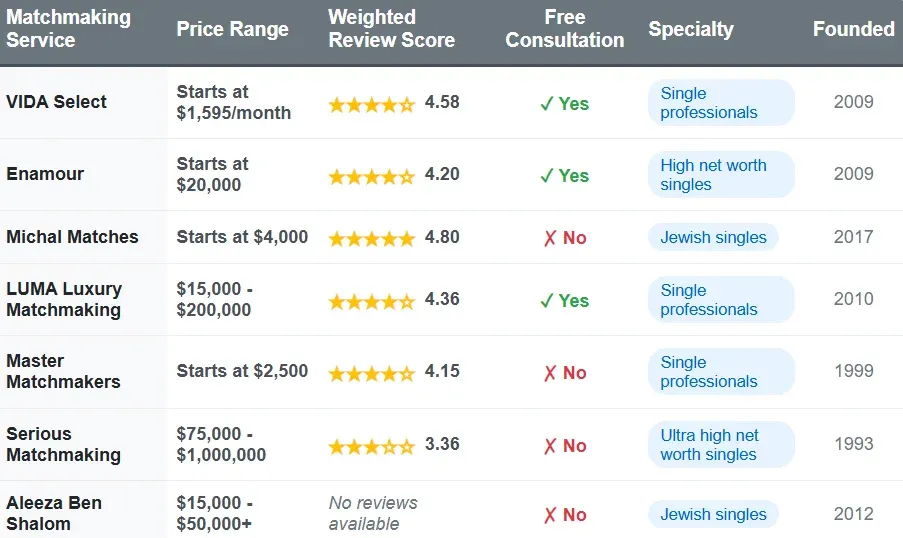 Matchmaking ServicePrice RangeTotal ReviewsWeighted Review ScoreFree ConsultationSpecialtyFounded