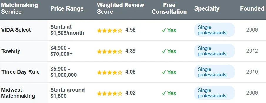 | Matchmaking Service | Price Range | Total Reviews | Weighted Review Score | Free Consultation | Specialty | Founded |