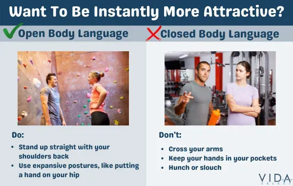 Success tip: Start with low-stakes interactions to build confidence. Practice expansive body language - keep shoulders back, avoid crossing arms, and use occasional hand gestures to appear more confident and attractive.