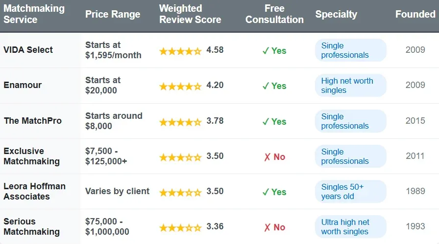 Matchmaking ServicePrice RangeTotal ReviewsWeighted Review ScoreFree ConsultationSpecialtyFounded