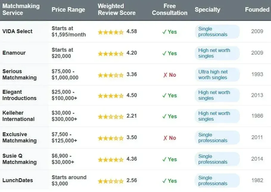 | Matchmaking Service | Price Range | Total Reviews | Weighted Review Score | Free Consultation | Specialty | Founded |