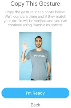 Bumble fake profiles aren’t all that common, at least compared to Tinder or a free dating site like POF. That’s largely due to Bumble’s verification process. It prompts you to take a selfie while copying a specified gesture, like this one: