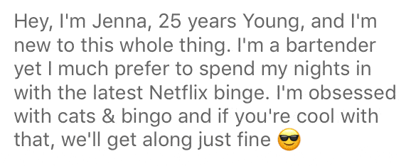 • Your bio should provide easy conversation starters that make it simple for matches to message you with something meaningful