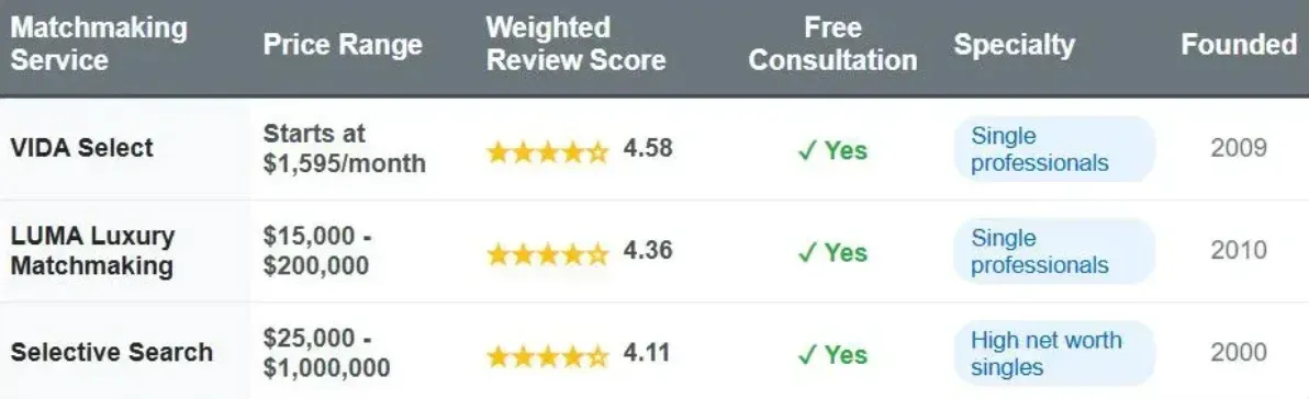 • Mid-range: LUMA Luxury Matchmaking services from $15,000-$200,000+ - clients receive at least 3 vetted matches from their database after extensive screening.