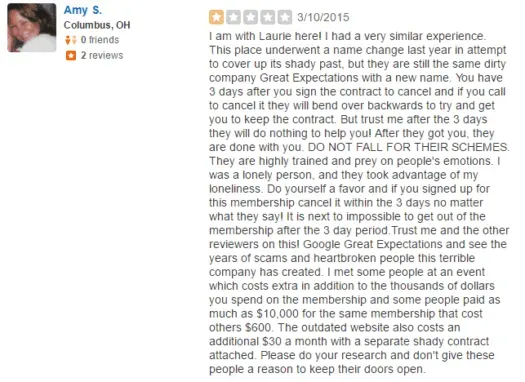 Columbus Singles has a 1½ star rating on Yelp. Of the 12 recommended reviews, 10 gave them a single star.