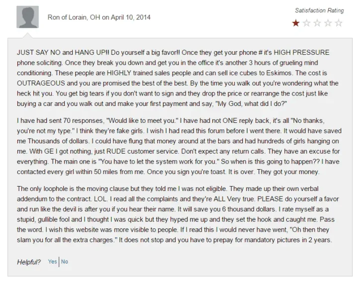 Complaints lodged against it by Ohio residents include high pressure sales tactics, poor customer service, and unresponsive matches: