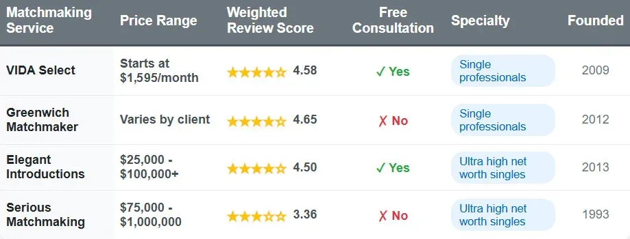 Matchmaking ServicePrice RangeTotal ReviewsWeighted Review ScoreFree ConsultationSpecialtyFounded