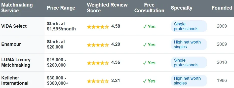 | Matchmaking Service | Price Range | Total Reviews | Weighted Review Score | Free Consultation | Specialty | Founded |