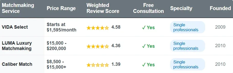 | Matchmaking Service | Price Range | Total Reviews | Weighted Review Score | Free Consultation | Specialty | Founded |