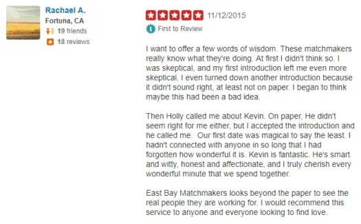 And these two clients weren’t thrilled with the service originally, but thought East Bay Matchmakers was able to fix the problems: