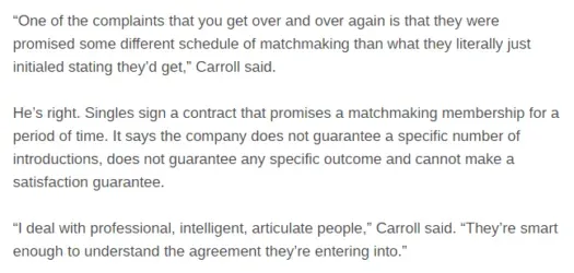 For instance, this client felt that what was promised during the initial consultation wasn’t what she ended up getting, both in terms of her matches and customer service: