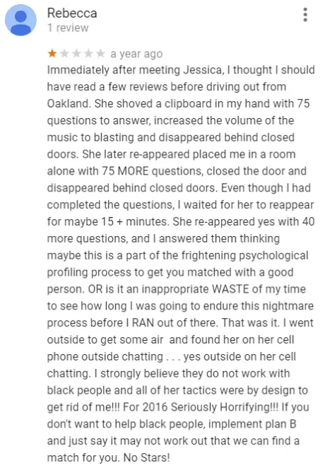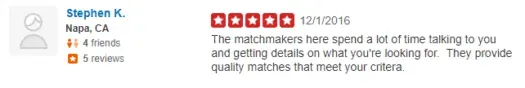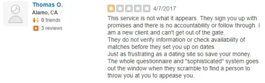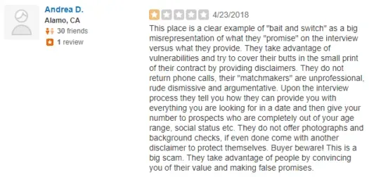 Those are the high points. The rest of the Yelp reviews painted a somewhat different picture of this California matchmaking service.