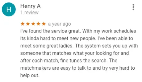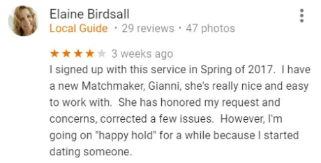They have a solid 3.5 star rating on Google, with reviews ranging from 1 to 5 stars. On the positive side, this client thought he received great customer service and was happy with his matches: