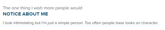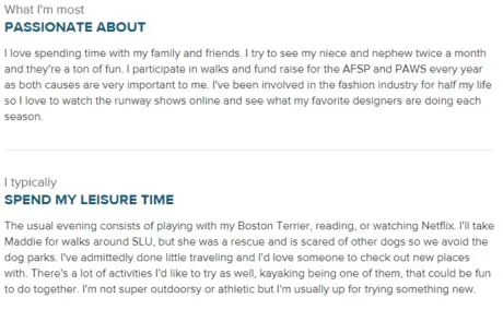 Instead, profiles are broken into a series of smaller sections, each containing tidbits of information like “What I’m most passionate about” and “How I spend my leisure time…”