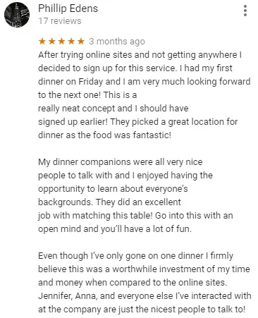 The positive reviews were from members who enjoyed the dinner venues, and thought they were matched with interesting people: