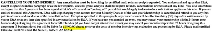 Here is the “cancelling your membership” portion of an Events And Adventures policy, courtesy of a Yelp reviewer who joined the Denver Singles Club: