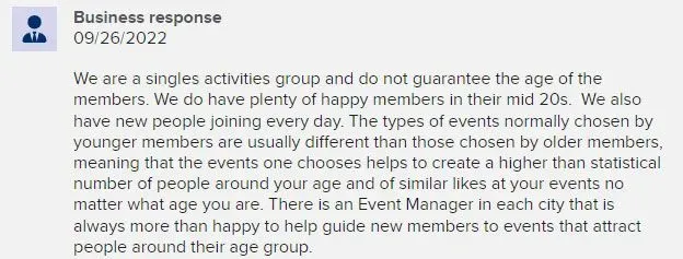 One reviewer complained singles at the events he attended were older than he was looking to date, and in the response Events And Adventures explained they don't organize events by age: