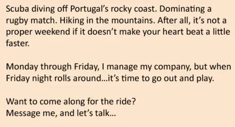 There’s a lot going on behind the scenes in both of these examples. The bios imply that you’re successful, in good shape, and have the financial means to travel without having to spell it out in an obvious way. Remember, showing is always sexier than telling.