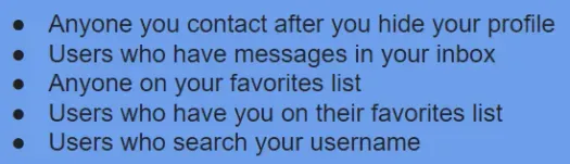 But even while hidden, your profile is still selectively visible. Here is the list of people who can still see it: