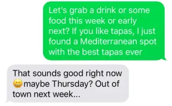 Let's say she’s giving you signs she’s not totally feeling it (i.e. 1 or 2 word replies or 24+ hour response time), or when you do ask her out over text she responds with a "no" or a "maybe."