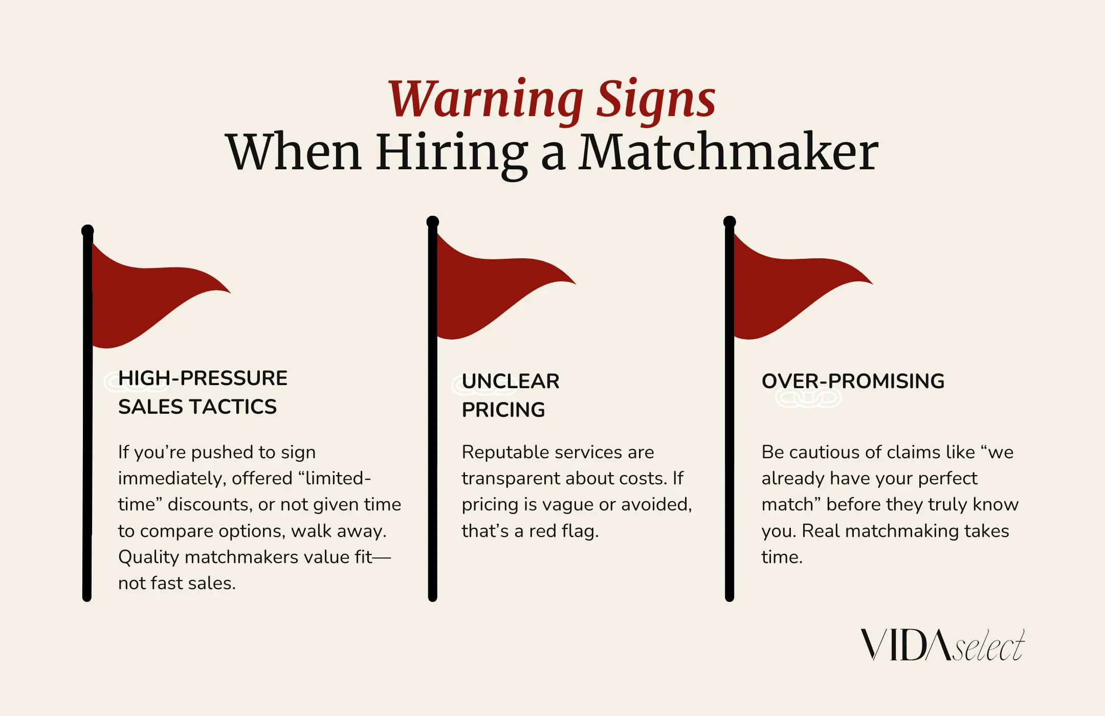 Legitimate matchmakers focus on fit, not quick sales. Red flags include same-day signing pressure, artificial discounts, a laser focus on the current state of your finances, or reluctance to let you think it over. Quality services encourage you to research and compare options.