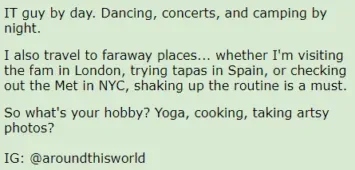 Choose a few of your most attractive traits, like your job or some interesting hobbies, and highlight those: