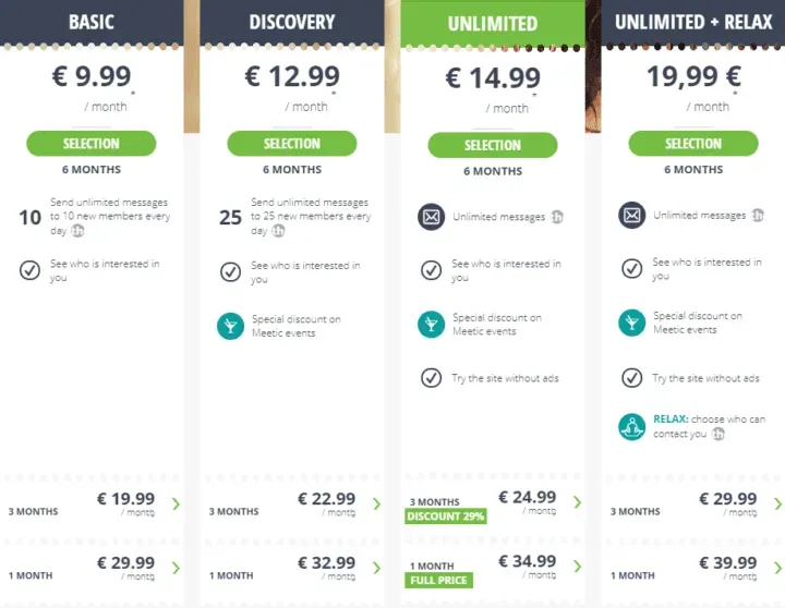 A premium membership starts at £0.94/week, and includes advantages like sending messages without matching first, seeing who “liked” and “favorited” you without spending credits, and priority access to the newest users.