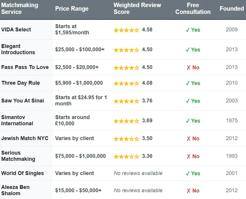 The 10 best Jewish matchmakers range from $65/month (Saw You At Sinai) to $1,000,000+ (Serious Matchmaking). Top-rated services include VIDA Select for flexibility ($1,595+/month), Three Day Rule for comprehensive service ($5,900+), and J Elegant Introductions for professionals ($25,000+). Services span Orthodox to Reform Jewish singles.