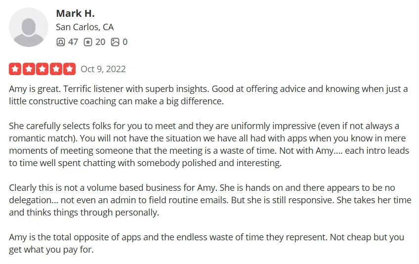 Of course, while internet reviews can be helpful in terms of giving you some food for thought, at the end of the day only you can decide if Amy Andersen’s style of matchmaking is a good fit for you.