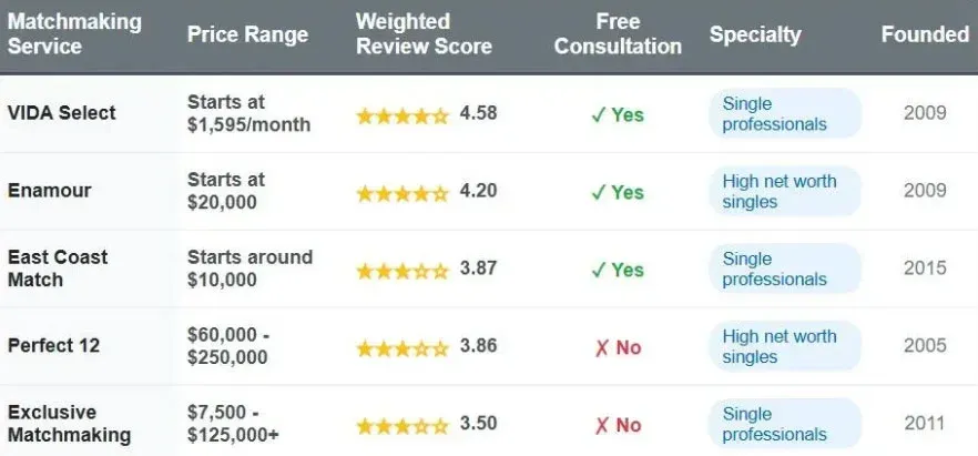 | Matchmaking Service | Price Range | Total Reviews | Weighted Review Score | Free Consultation | Specialty | Founded |