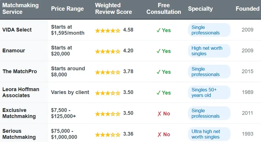 MatchmakerPrice RangeTotal ReviewsWeighted Review ScoreFree ConsultationSpecialtyFounded