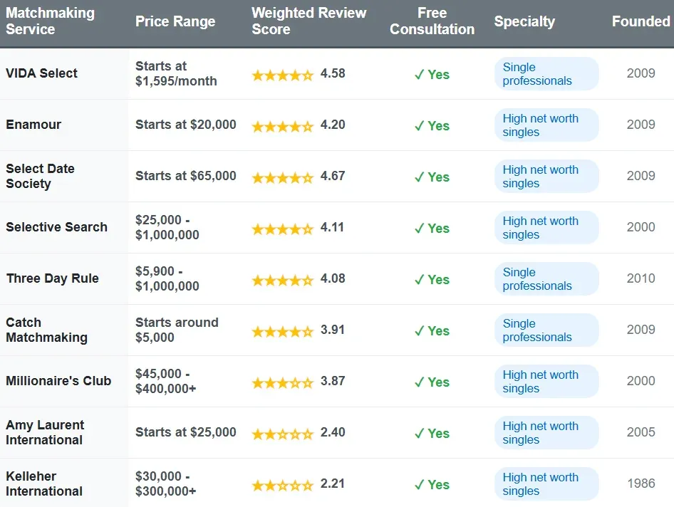 Matchmaking ServicePrice RangeTotal ReviewsWeighted Review ScoreFree ConsultationSpecialtyFounded