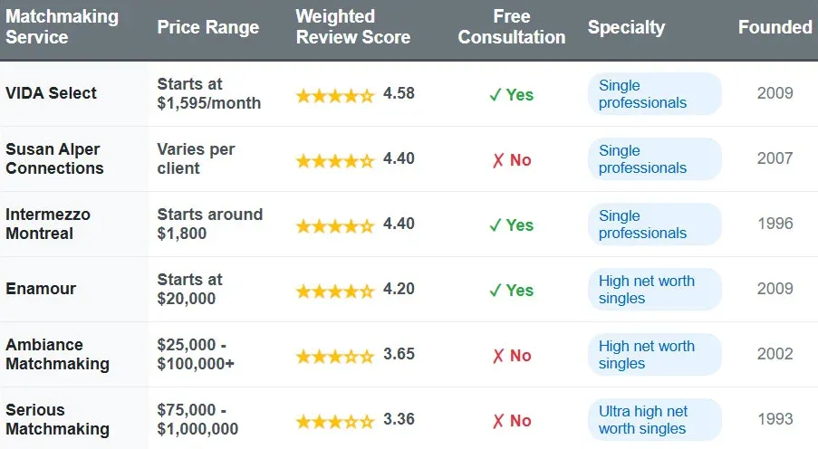 Matchmaking ServicePrice RangeTotal ReviewsWeighted Review ScoreFree ConsultationSpecialtyFounded