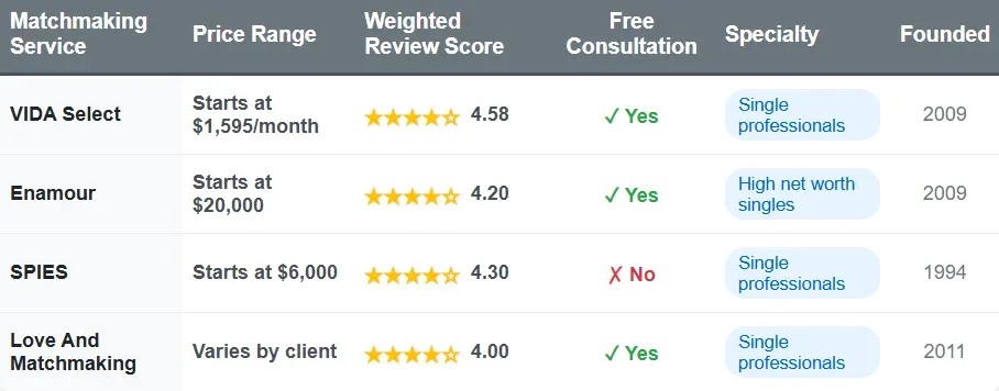 | Matchmaking Service | Price Range | Total Reviews | Weighted Review Score | Free Consultation | Specialty | Founded |