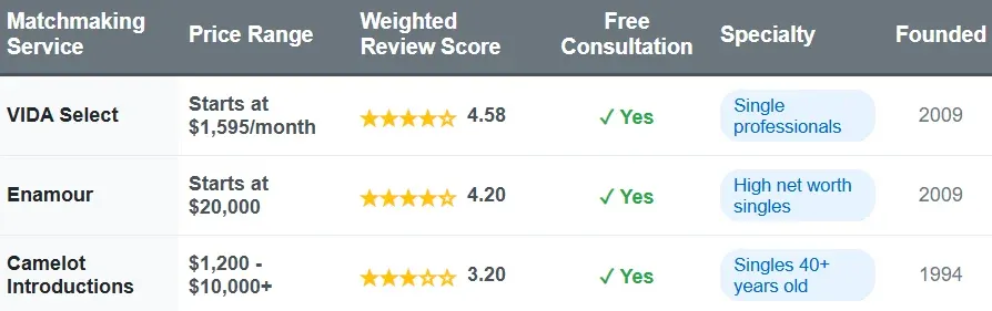 Matchmaking ServicePrice RangeTotal ReviewsWeighted Review ScoreFree ConsultationSpecialtyFounded