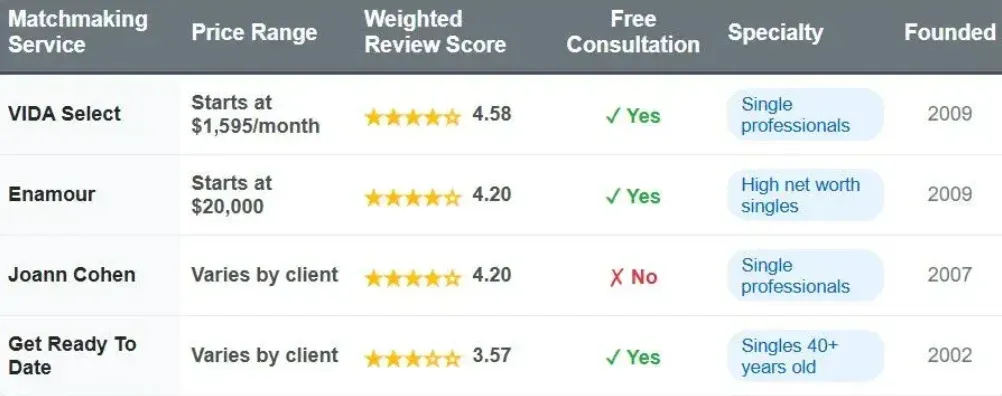| Matchmaking Service | Price Range | Total Reviews | Weighted Review Score | Free Consultation | Specialty | Founded |