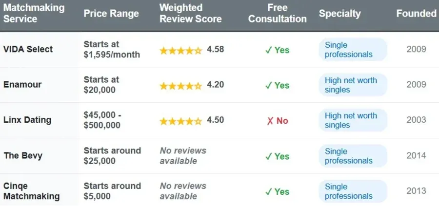 | Matchmaking Service | Price Range | Total Reviews | Weighted Review Score | Free Consultation | Specialty | Founded |