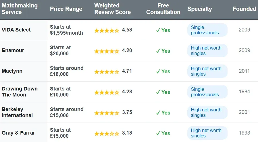 Matchmaking ServicePrice RangeTotal ReviewsWeighted Review ScoreFree ConsultationSpecialtyFounded