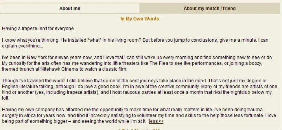 You’ve optimized yourself enough to make me, Hypothetical New York-Based Lady, decide to click on the link to your profile for further inspection. The last thing you want now is to ruin all your good work by describing yourself like so: