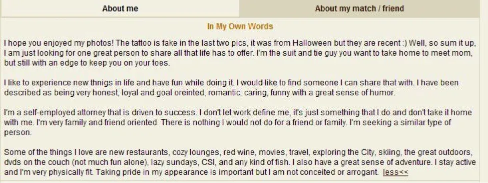 First off, if you don’t speak or write according to the conventions of Standard English, find someone who does and have them write your profile. Capitalizing every word makes you look like a 12-year-old girl who dots her “i”s with hearts.