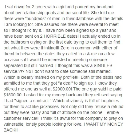 Another reviewer was able to get a refund within 3 days of signing up, and felt like the matchmaking service in general was very “unprofessional:”