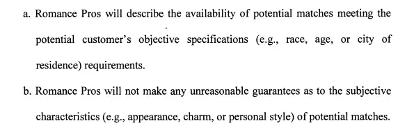 In 2012, Romance Pros International had to pay over $21,000 in restitution and fees to customers, and it was ordered to comply with the state’s Deceptive and Unfair Trade Practices Act, including: