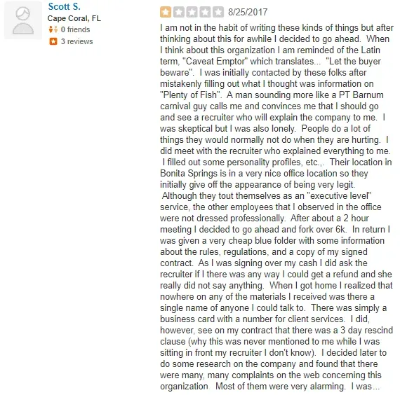 There don’t seem to be a lot of online reviews for this Florida matchmaking service, but the available ones aren’t great.