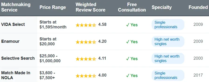 | Matchmaking Service | Price Range | Total Reviews | Weighted Review Score | Free Consultation | Specialty | Founded |
