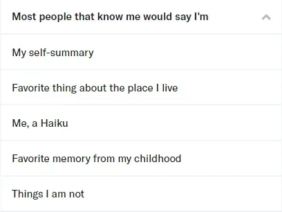For each topic, you can choose which prompt youâd like to answer from a simple pull-down menu of 5 or 6 choices: