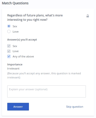 You answer the question for yourself, and then for your ideal match. You can also specify how important it is for you to share the same answer, and add additional details in a text box.