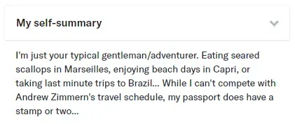 Here's another example of a good OkCupid self-summary answer: