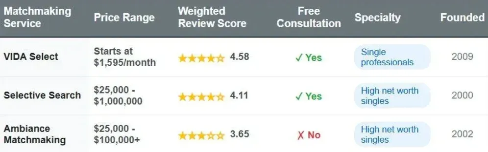 Matchmaking ServicePrice RangeTotal ReviewsWeighted Review ScoreFree ConsultationSpecialtyFounded